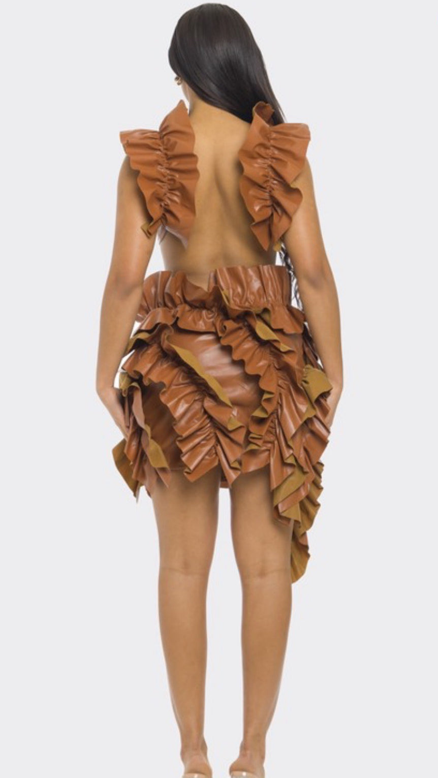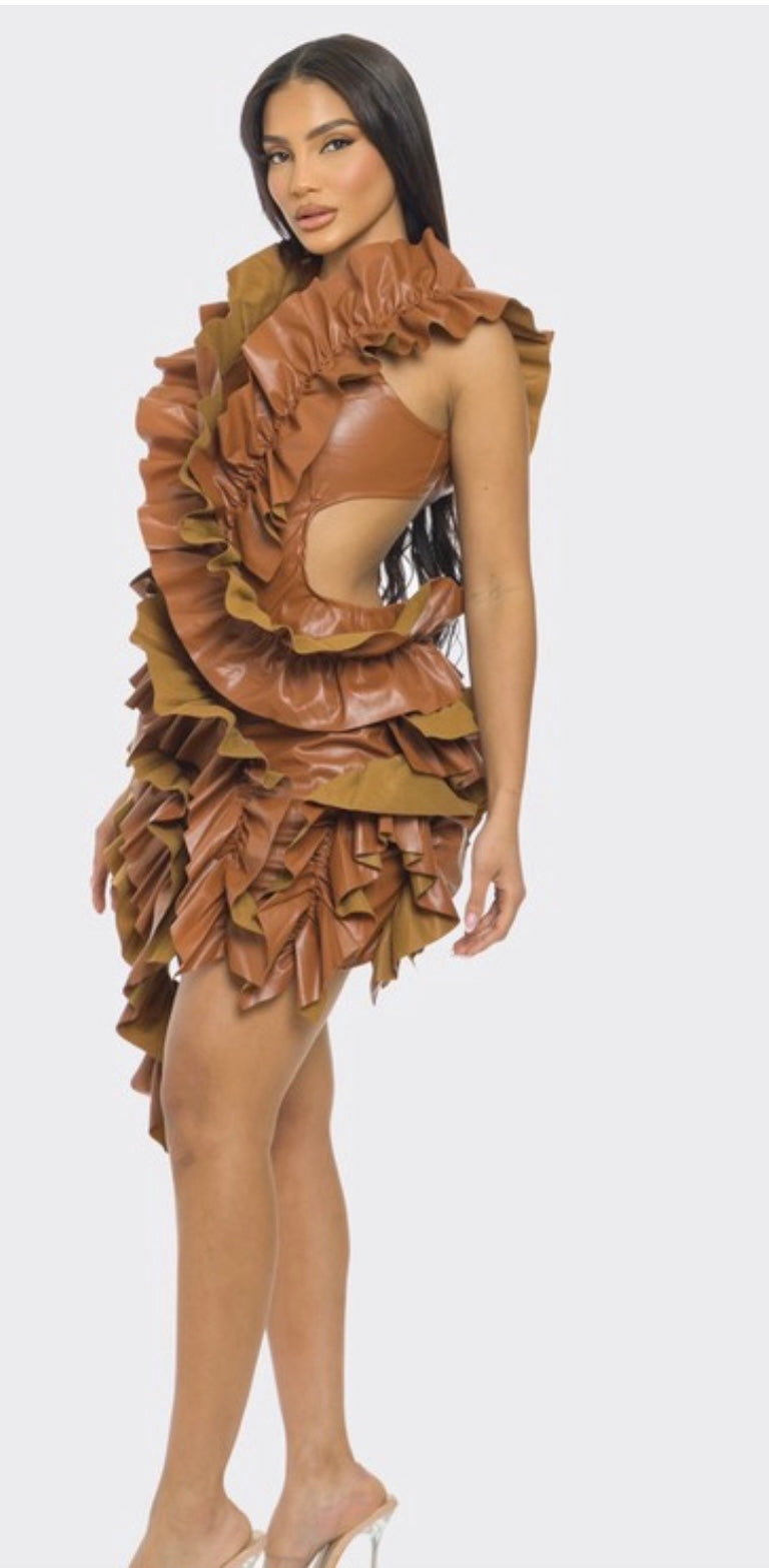 Become the talk of the town in The Plush Gang Dress. This slightly stretchy faux leather piece features a mock neckline, wide inner tank straps, pleated ruffle shoulder detailing that trails down the front and back bodice, contour seaming, and a mini length. Complete with polyester inner lining and a pull-on bodycon fit.